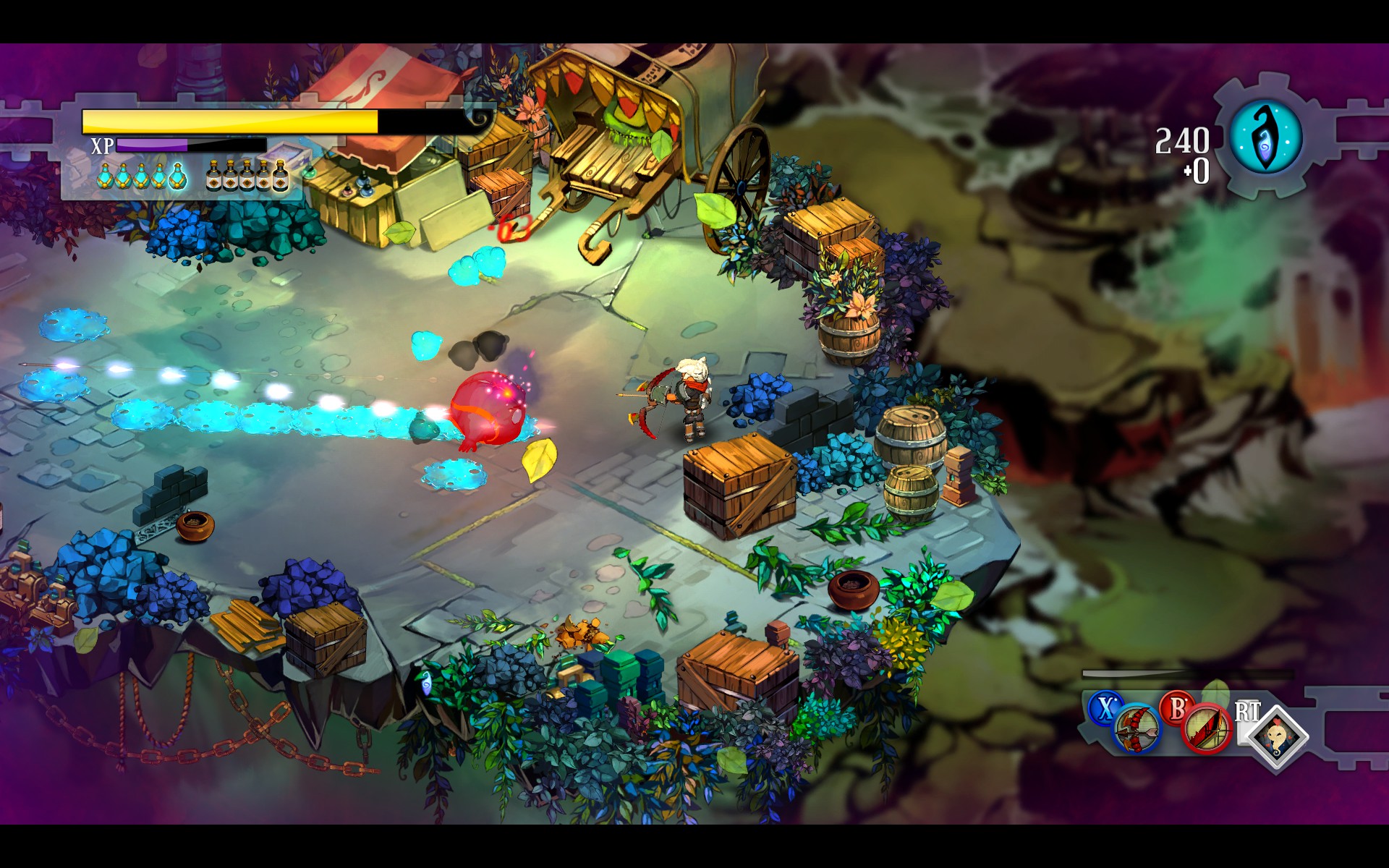 The first thing you encounter in this game is the narrator, which you learn quite quickly is Rucks. But what makes the narrator awesome is that unlike other games where narration fires off based on events or locations – i.e. you cross a certain doorway and a block of narration kicks in telling you about the place you’ve just entered – it is also based on your actions. When you first get into the game, your character is in bed. If you do nothing, nothing happens, but the moment you move the controls and the Kid gets up, the narrator fires off something like “the Kid gets out of bed”. Later, when I was in a room full of boxes, taking my time to destroy them all and collect the items the game uses for money, the narrator said, “the Kid rages around, destroying everything in his path” or something close to it. If you double back on your path too many times it might say, “the Kid wasn’t sure where he was going, but he was getting there fast”. If you run past enemies rather than fighting them you might get a “the Kid was moving fast, no looking back”. It adds an element to the game that other narrations don’t simply because the narration is based on my actions (or lack thereof) and not just my location.